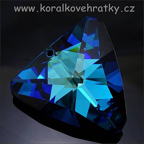 Broušený tvar s efektem od českého výrobce. Jednodírkový broušený trojúhelník. Vhodný k zavěšení na šlupnu. Zadní část trojúhelníku je stříbrná lesklá, viz. připojené obrázky.