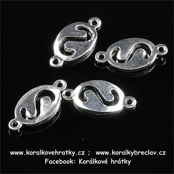 - Korálek, mezikus "S" v oválu, kov, 14x6mm, barva stříbra (balení 20ks)