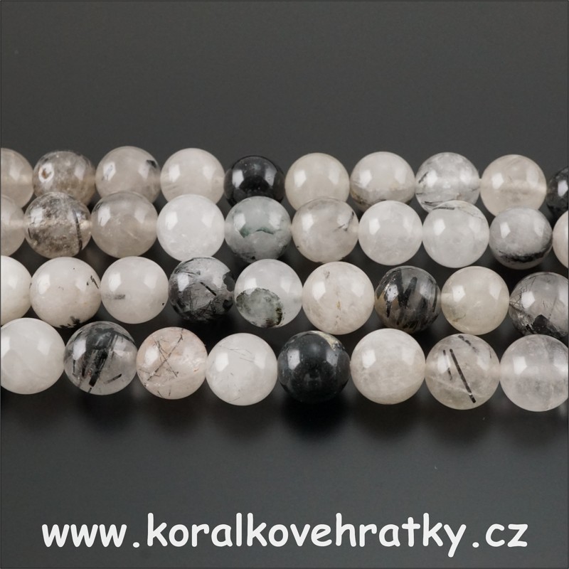 - Minerální korálky, 8mm, Křišťál s Turmalínem / balení 10 ks