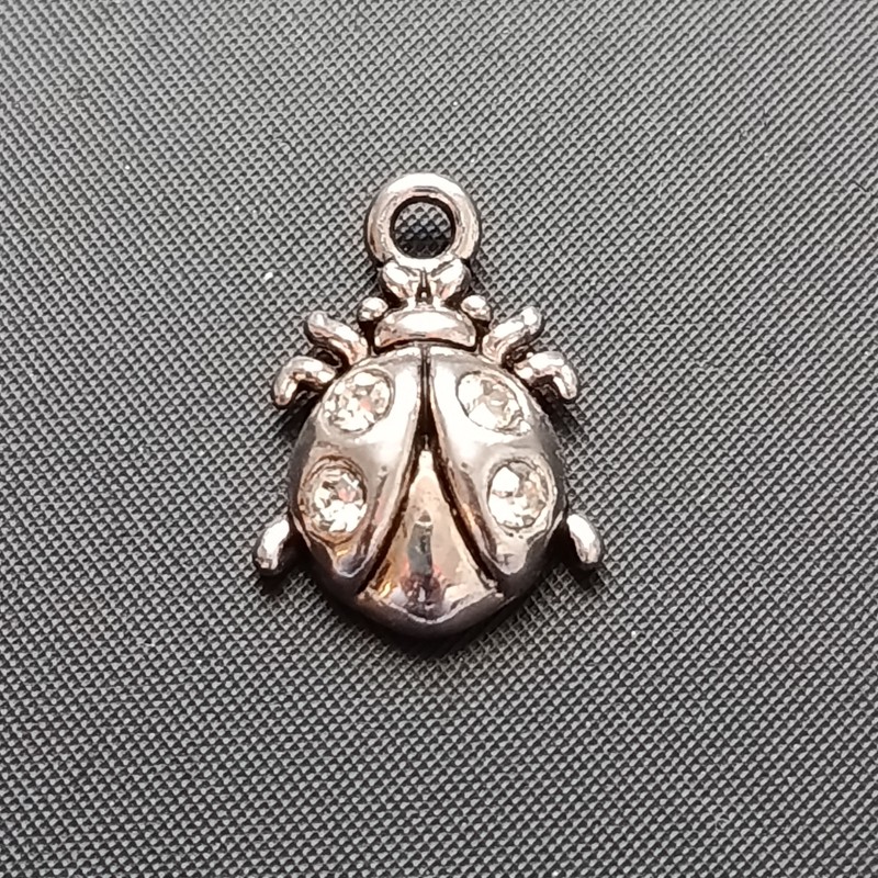 Přívěšek beruška, kov, 20x14mm, barva platina, kamínky čiré, balení 3 ks