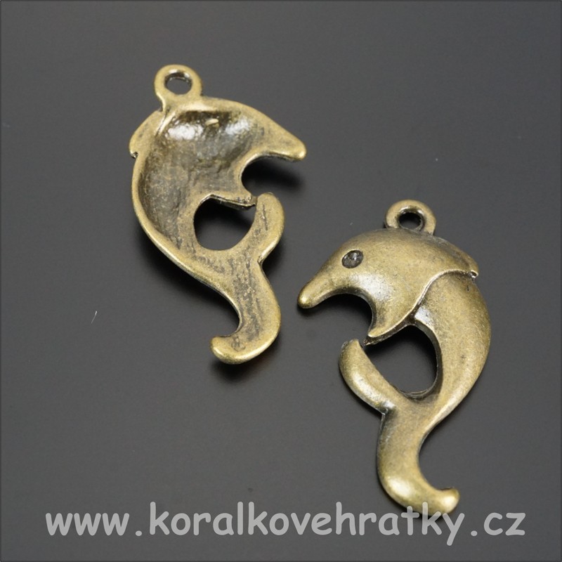 Přívěsek delfín, kov, 25x14mm, barva staromosaz (balení 16ks)