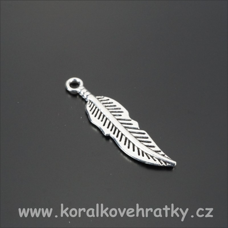 Přívěsek pírko, kov, 30x8x1,5mm, barva platina (balení 10ks)
