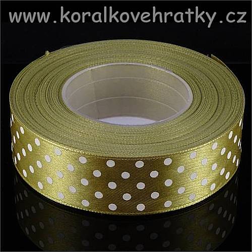 Stuha saténová 25 mm s puntíky tm. starozlatá ( balení 22 m )