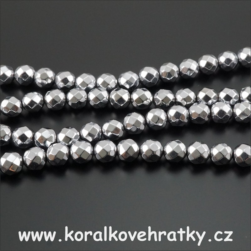 - HEMATIT, fasetovaný, stříbrný pokov 6-7 mm, minerální korálky / balení 30 ks