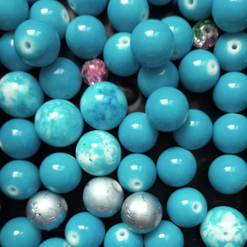 Mix skleněných korálků 11-14 mm, většinu tvoří celé modré a mramorované korálky, sáček může obsahovat i zlomek různorodých skleněných korálků.