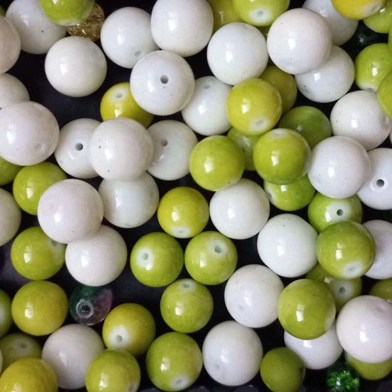 Mix skleněných korálků 10-12 mm, většinu tvoří zelené a bílé korálky, sáček může obsahovat i zlomek různorodých skleněných korálků.