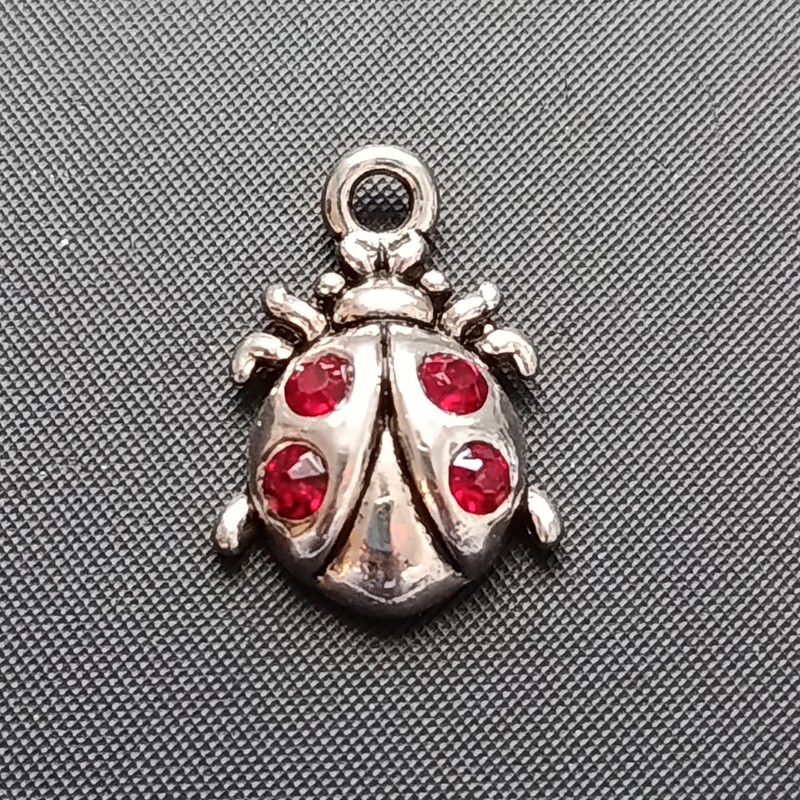 Přívěšek beruška, kov, 20x14mm, barva platina, kamínky červené, balení 5 ks