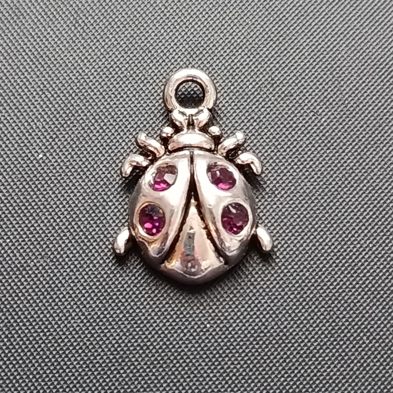 Přívěšek beruška, kov, 20x14mm, barva platina, kamínky fialové, balení 3 ks