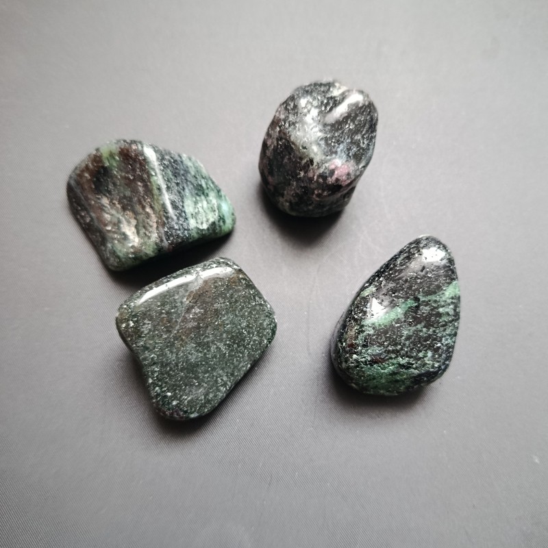 Jedná se větší tromlované kousky minerálu zoist o velikosti cca 3-5 cm a hmotnosti 35-60g.